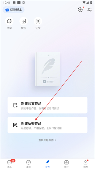 2、在写作页面,点击新建私密作品选项。
