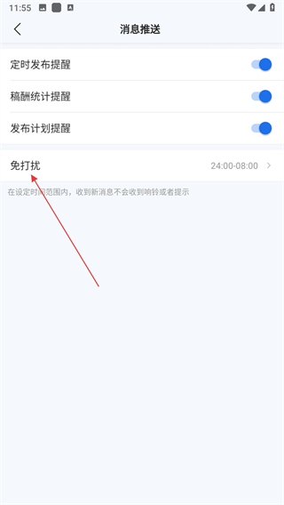 3、在消息推送页面,点击免打扰选项,进入时间设置页面。
