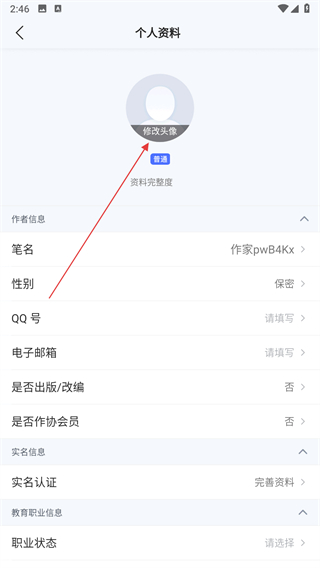 3、在个人资料页面,找到头像区域的修改头像按钮,点击弹出头像选择菜单。