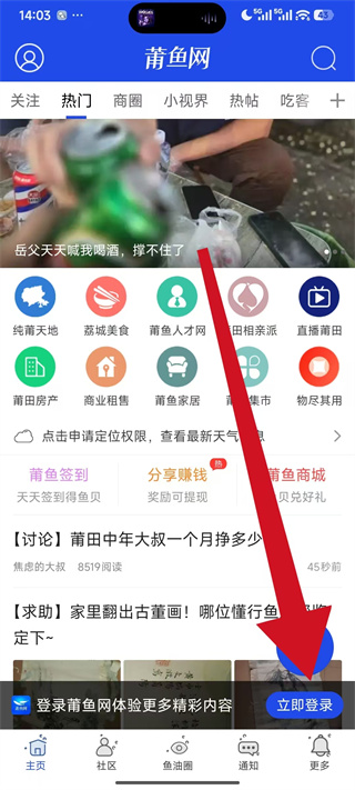 1、打开莆田小鱼网,在首页点击立即登录,进入登录页面。