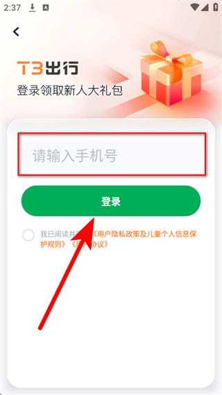 3、在登录页面的请输入框中填写手机号,勾选相关协议后点击登录。