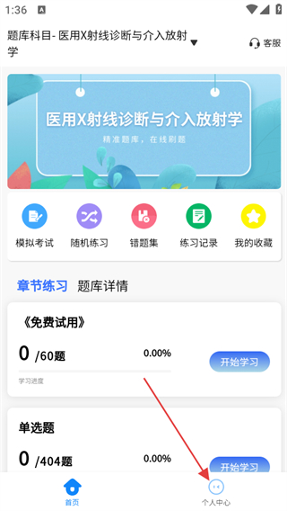 1、在辐射安全与防护考试学知题首页,点击底部的个人中心选项,进入个人中心页面。
