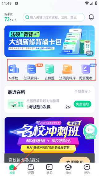 1、打开觉晓法硕app,具备智能AI择校功能,法硕背背、去做题、法硕资料库、周测模考。