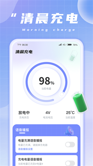 清晨充电专为手机充电打造,拥有电量语音播报、个性提示音、充电动画等服务,每个用户可以根据自己的需求来开启对应功能,打造你的个性手机充电。