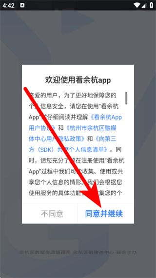 1、打开看余杭,在协议提示框,点击同意并继续,进入主界面。