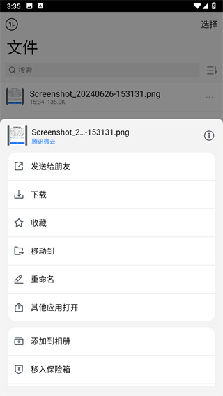 在腾讯微云APP的文件列表中,可以查看上传到微云的文件,选择发送给朋友、下载、打开或者其他操作