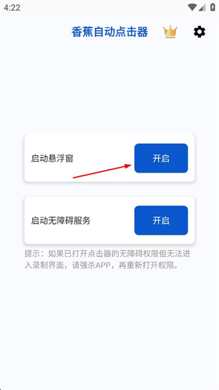 1、打开香蕉自动点击器,点击启动悬浮窗右侧的开启按钮,启用悬浮窗功能。