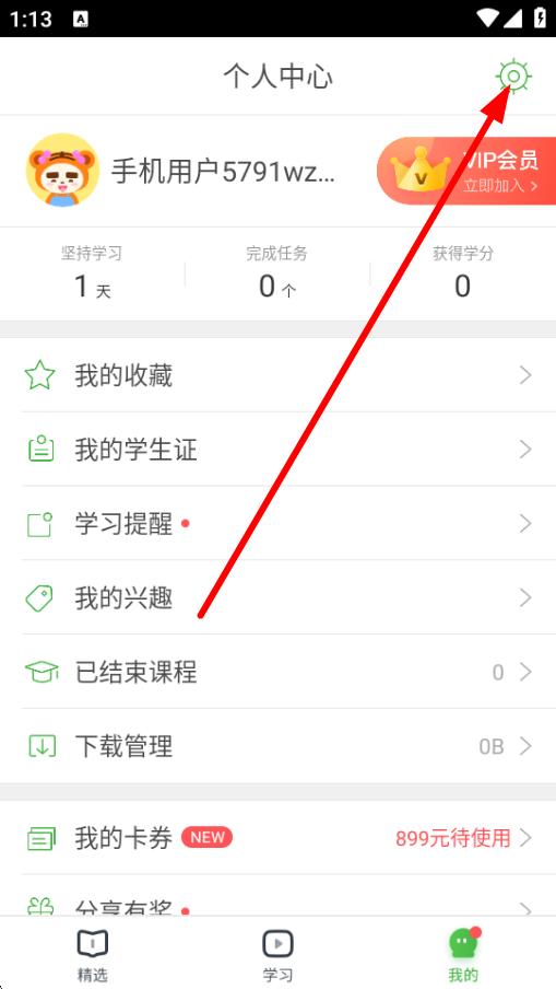 1、打开沪江网校app进入我的界面,点击个人中心右上角设置图标。