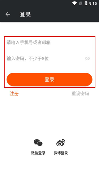 3、在登录页面,输入手机号或邮箱,填写密码后点击登录。