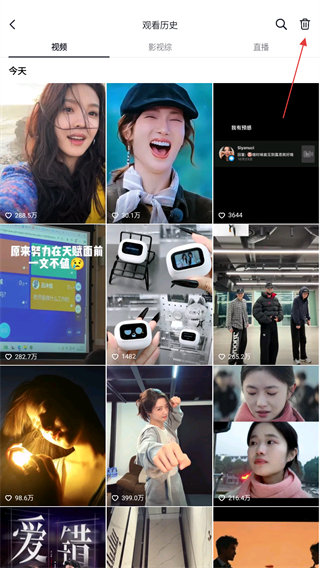 3、进入观看历史的页面内,点击右上角删除的图标。