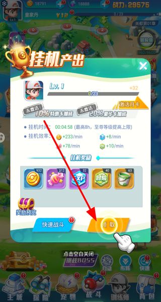 4、挂机产出界面点击领取按钮,获取挂机积累的奖励,积累资源用于宝可梦的培养与发展。