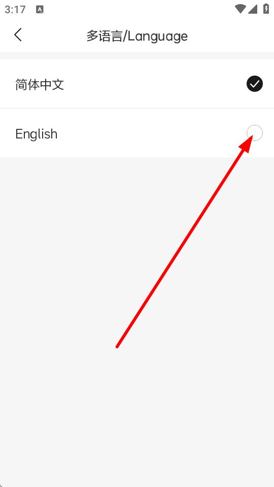 4、在多语言选择界面,点击选择English或其他所需语言,即可完成语言设置。