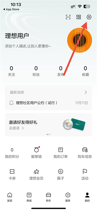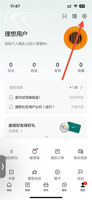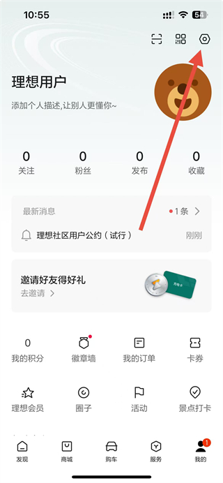 1、打开理想汽车app,在我的页面点击右上角设置图标,进入设置页面。