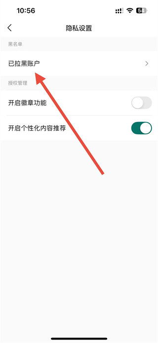 3、在隐私设置页面,点击已拉黑账户选项,进入黑名单页面。