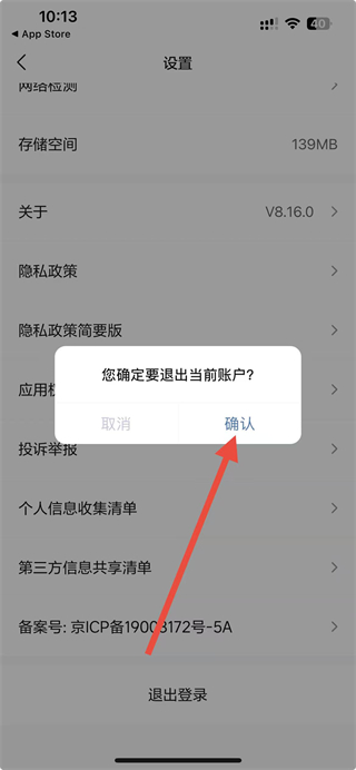 4、在弹出的您确定要退出当前账户的弹窗中,点击确认按钮,完成退出登录操作。