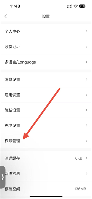 3、在设置界面,点击权限管理选项,进入权限管理列表页面。