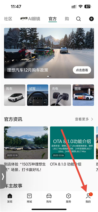 1、打开理想汽车app,进入首页后点击底部我的选项。