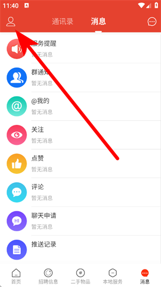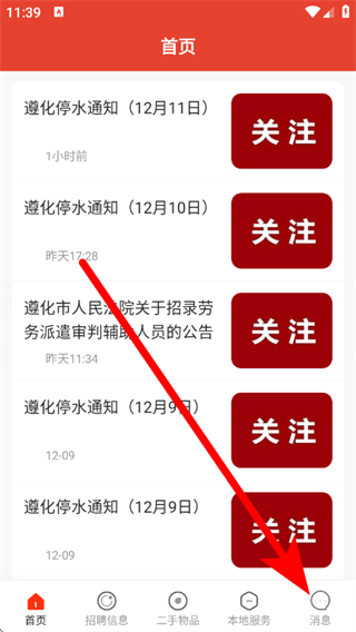 1、打开遵化生活圈,点击底部消息,进入消息页面。