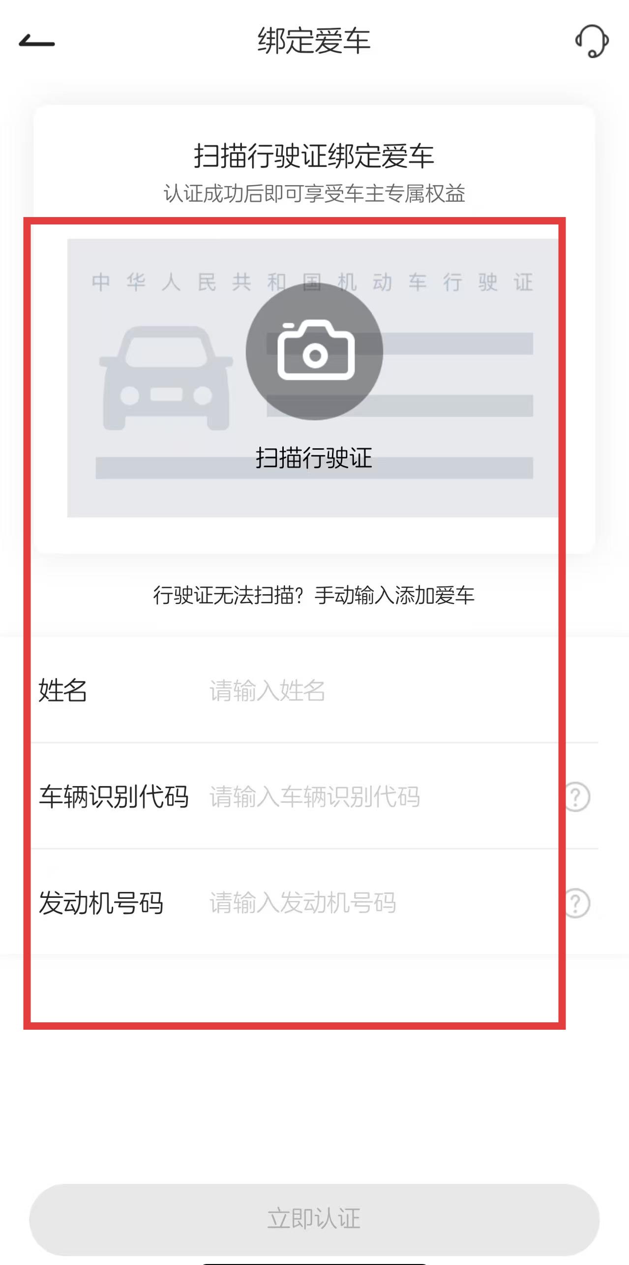 4、进入绑定爱车界面,并按提示操作,完成后点击立即认证,即可完成车辆绑定。