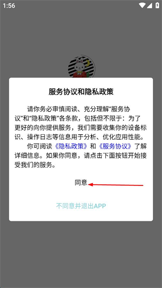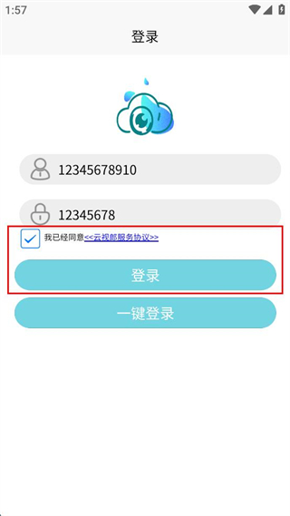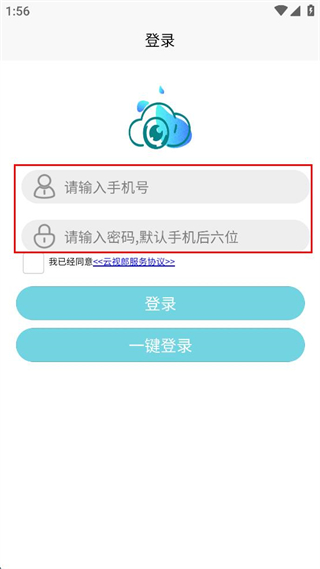 1、打开云观服软件,点击服务协议和隐私政策弹窗中的同意按钮,进入登录界面。