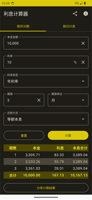 1、打开利息计算器软件,进入按月分期页面,点击切换至按日计息模式。
