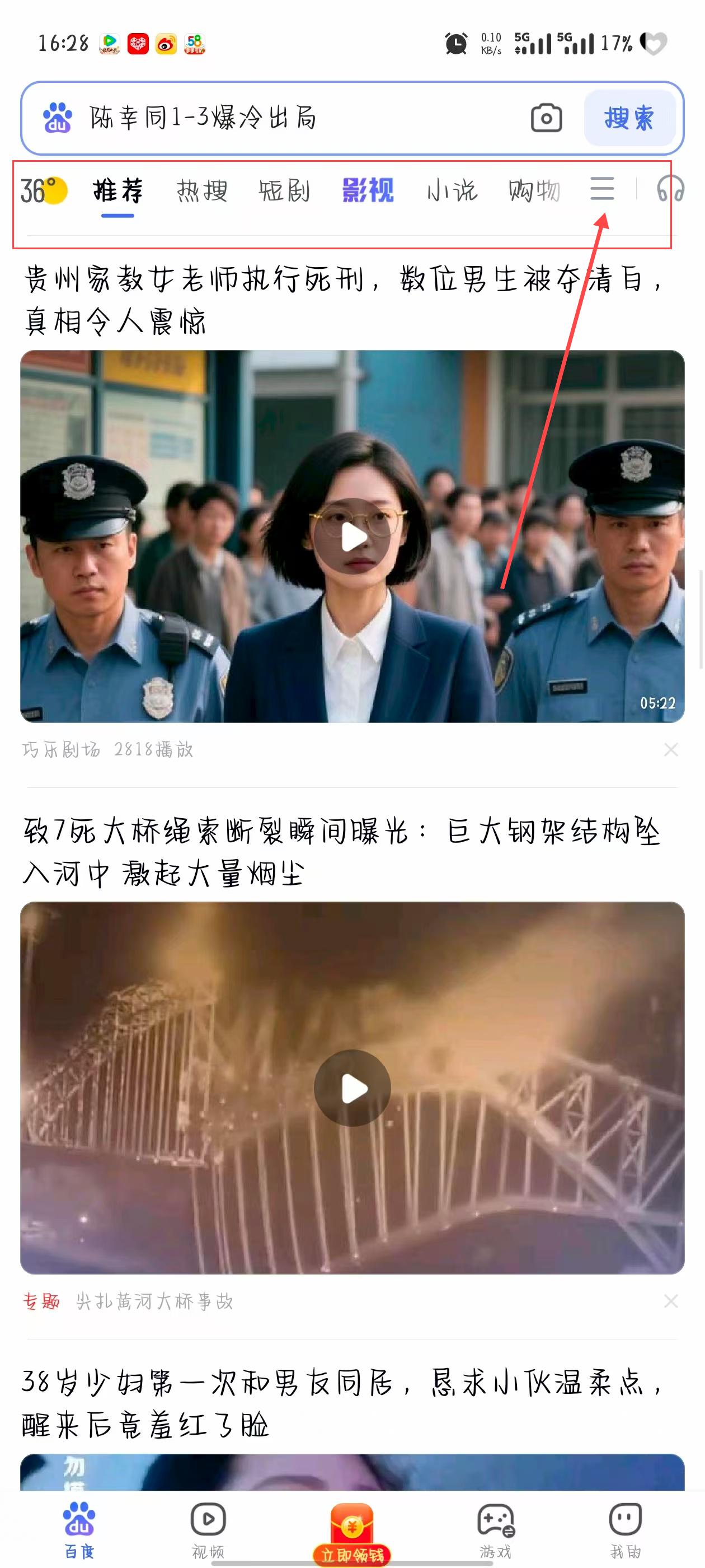 1、打开百度极速版进入首页,点击首页顶部导航栏中的三图标,进入全部频道页面。