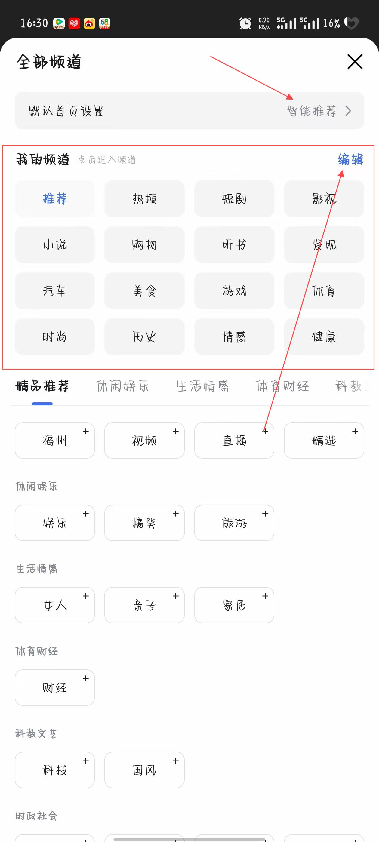 2、在全部频道页面,能看到我的频道区域,点击该区域右上角的编辑按钮,即可对已添加到频道栏的内容进行排序、删除等操作。