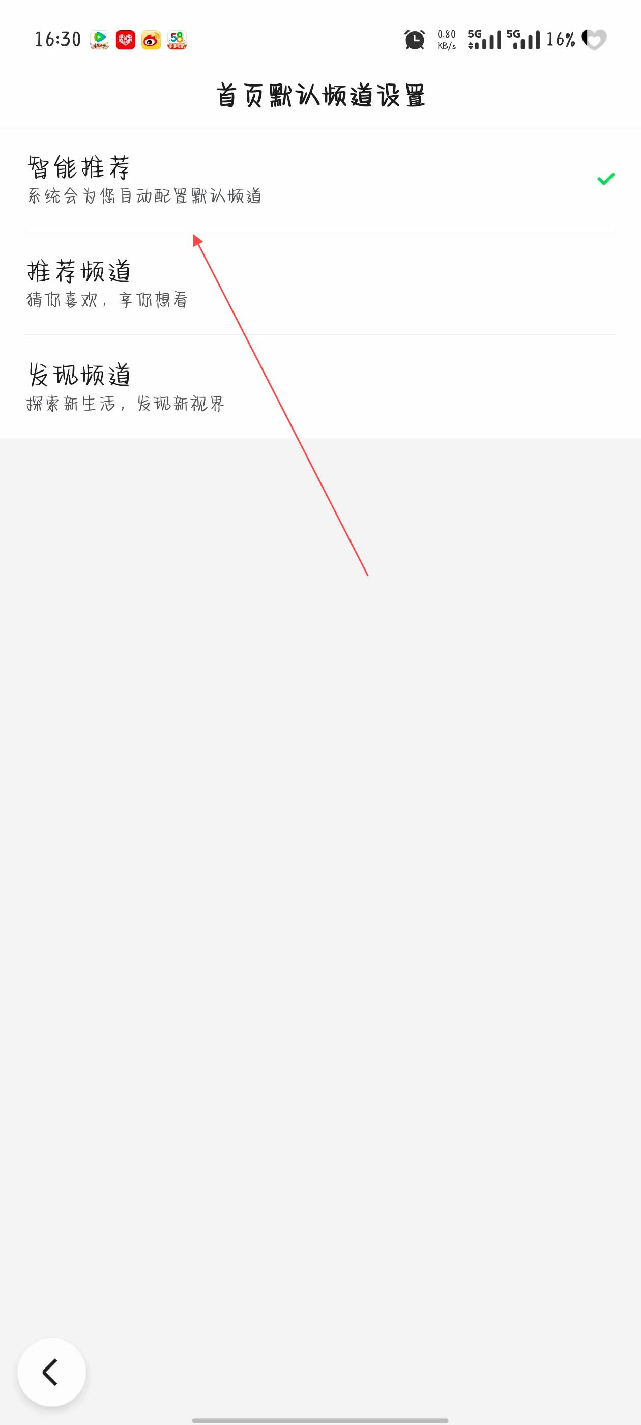 3、如果想要设置首页默认显示的频道类型,点击全部频道页面“默认首页设置右侧的智能推荐,在弹出的首页默认频道设置页面中,选择智能推荐,推荐频道或者发现频道等选项。