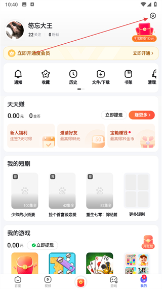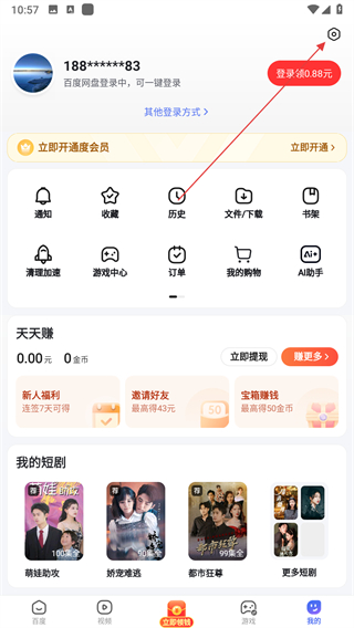2、在个人中心页面找到右上角的设置图标,点击该图标进入百度的设置管理界面。
