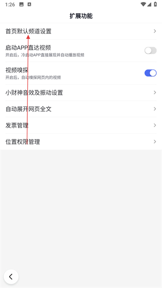 4、在扩展功能页面中选择首页默认频道设置,在对应页面挑选目标频道完成设置。