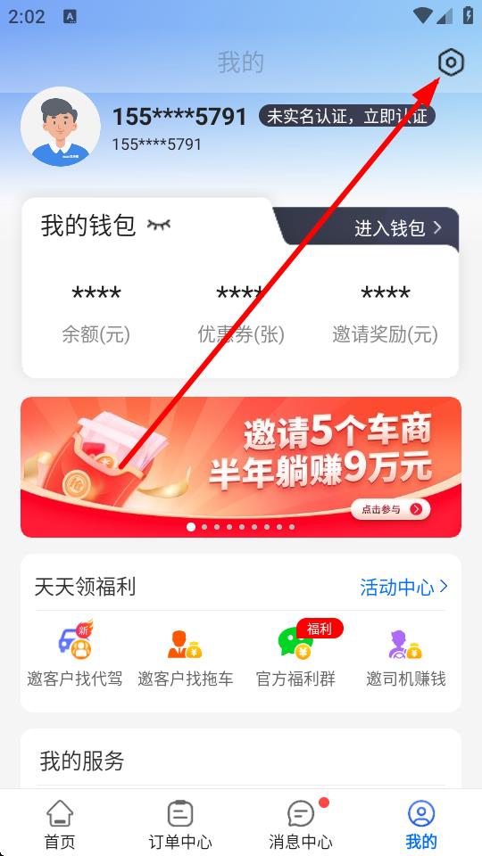 1、打开车拖车APP,点击首页下方导航栏中的我的进入个人中心页面。