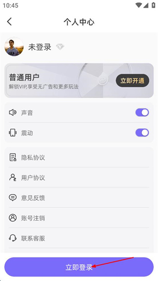 2、在弹出的界面中进入个人中心,查看账号状态及相关设置,点击立即登录按钮。