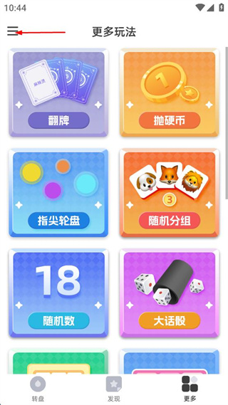 1、打开趣味工具软件,进入更多玩法页面,查看各类功能选项,点击左上角菜单按钮。