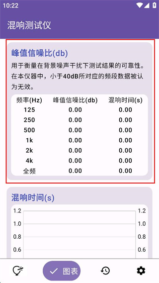 4、点击界面底部的图表选项,查看峰值信噪比混响时间等数据,获取测试结果。