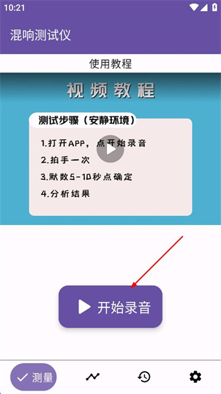 1、打开混响测试仪软件,查看界面显示的使用教程,点击开始录音按钮,进入录音流程。