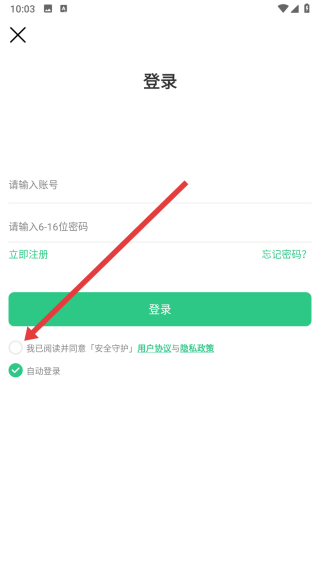 3、进入到账号登录页面中,需先点击勾选我已阅读并同意按钮。