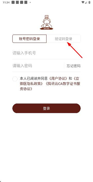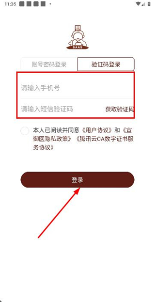 3、在验证码登录页面填写手机号和验证码,勾选协议后,点击登录完成账号登录操作。