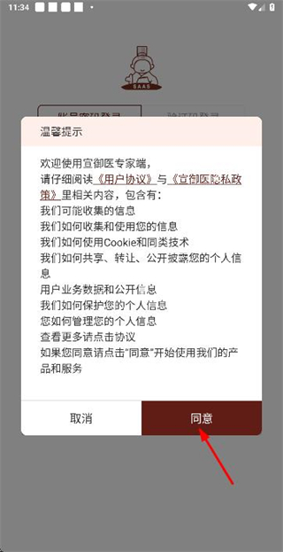1、在使用协议隐私政策弹窗中点击同意按钮,进入登录页面。