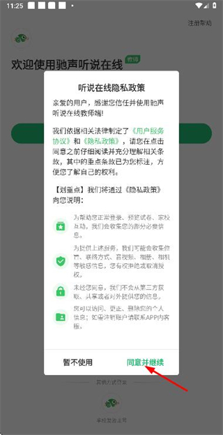 1、在使用协议隐私政策弹窗中点击同意并继续按钮,进入登录页面。