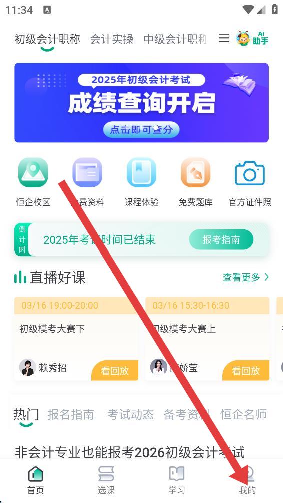 1、打开恒企会计,点击底部导航栏最右侧的我的选项。