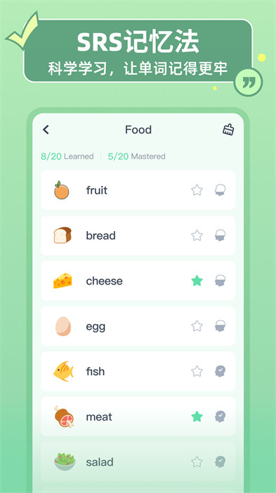 学习语言最怕今天学明天忘,而我们根据艾宾浩斯记忆遗忘规律,采用了SRS记忆法,自动计算记忆临界点,提醒复习,让单词记得更牢,效率更高。