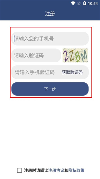 4、输入手机号、图形验证码、手机验证码,勾选协议后点击下一步。