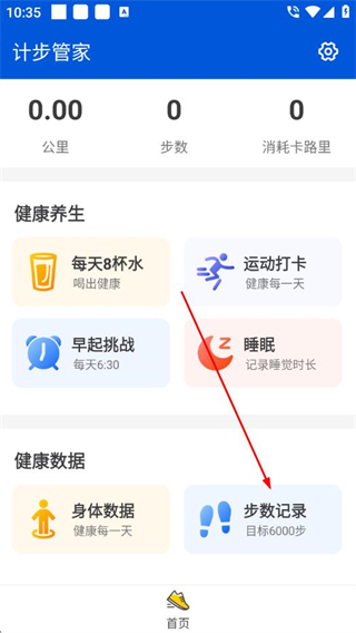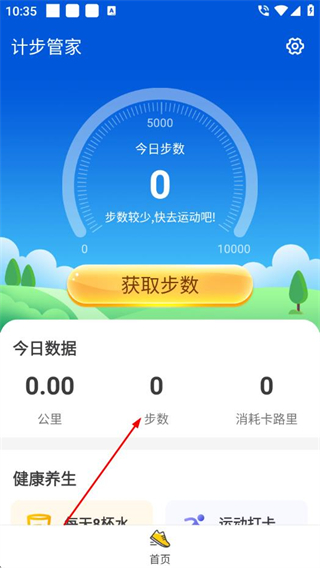 1、进入在计步管家app的首页,即可在步数处查看当日的步数。