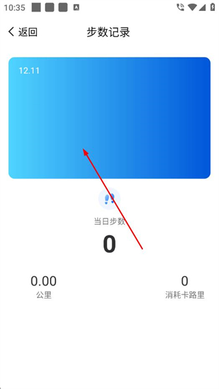 3、查看顶部的日期卡片,查看当日步数、公里数、消耗卡路里等记录。