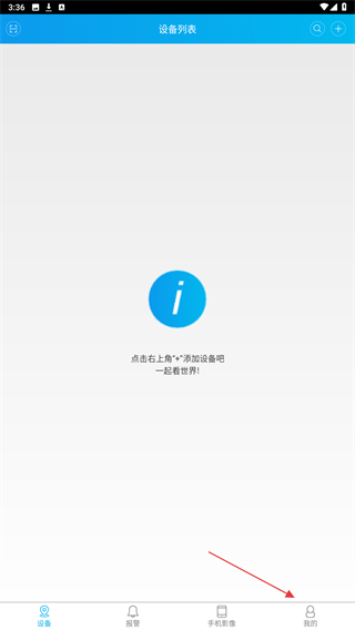 1、启动监控眼App,进入设备列表页面,点击底部导航栏的我的。