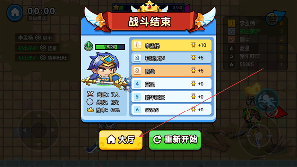 4、战斗结束后查看排名,点击重新开始开启新一轮对战。