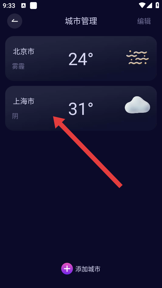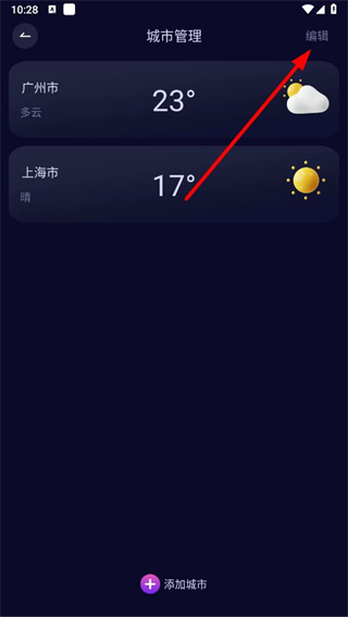 2、在城市管理界面,点击右上角编辑按钮,进入城市编辑模式。