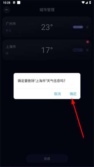4、在弹出的确认删除对话框中,点击确定按钮,即可删除该城市的天气信息。