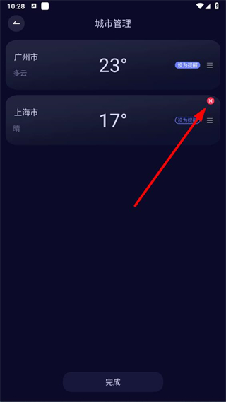 3、在城市编辑模式下,点击要删除城市右侧的红色叉号按钮。