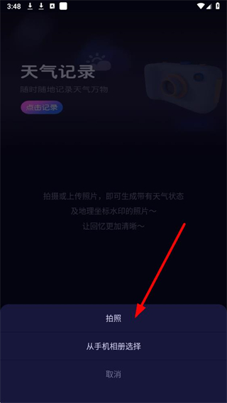 2、进入天气记录页面后,点击右下角的相机图标,弹出操作选项菜单。